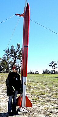 Samantha Ridgway was the first woman TRA Cert III Rocketeer in Australia. She flew the rocket she designed and built, named Lucky 7 on an M1500 Rocket Motor.
