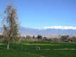 Jalalabad is home to a large number of fruits. Various types of citrus fruits like orange, tangerine, grapefruit, lemon, lime grow in gardens as well as in orchards.[31] The orange trees yield a crop only once in three years. The narindj variety of orange is the most common one which has yellow skin and its taste is a combination of orange and grapefruit. The grapefruits grown here have a diameter of eight or nine inches. Per year 1800 tonnes of pomegranates, 334 tonnes of grapes, and 7750 tonnes of mulberries are produced in Jalalabad.[35] The fruits are either sold in local markets or transported to Kabul markets from where they are exported. The second most common crop is local vatani variety of sugarcane. It contains 15% sugar by weight.[36] Jalalabad also has the largest date farm in Afghanistan.[37]