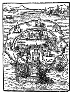 More's best known and most controversial work, Utopia, is a frame narrative written in Latin.[117] More completed the book, and theologian Erasmus published it in Leuven in 1516. It was only translated into English and published in his native land in 1551 (16 years after his execution), and the 1684 translation became the most commonly cited. More (who is also a character in the book) and the narrator/traveller, Raphael Hythlodaeus (whose name alludes both to the healer archangel Raphael, and 'speaker of nonsense', the surname's Greek meaning), discuss modern ills in Antwerp, as well as describe the political arrangements of the imaginary island country of Utopia (a Greek pun on 'ou-topos' [no place] and 'eu-topos' [good place]) among themselves as well as to Pieter Gillis and Hieronymus van Busleyden.[118] Utopia's original edition included a symmetrical "Utopian alphabet" omitted by later editions, but which may have been an early attempt or precursor of shorthand.