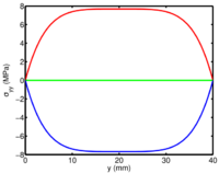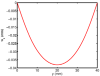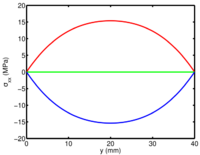 Displacement and stresses along [math]\displaystyle{ x=a/2 }[/math] for a rectangular plate with [math]\displaystyle{ a=20 }[/math] mm, [math]\displaystyle{ b=40 }[/math] mm, [math]\displaystyle{ H=2h=0.4 }[/math] mm, [math]\displaystyle{ E=70 }[/math] GPa, and [math]\displaystyle{ \nu=0.35 }[/math] under a load [math]\displaystyle{ q_0 = -10 }[/math] kPa. The red line represents the bottom of the plate, the green line the middle, and the blue line the top of the plate.