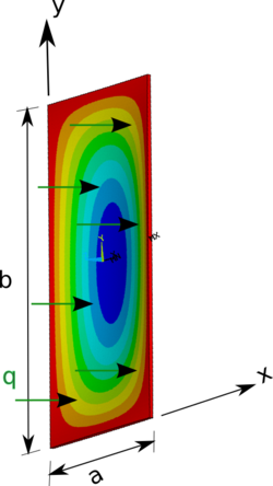 Here [math]\displaystyle{ q_0 }[/math] is the amplitude, [math]\displaystyle{ a }[/math] is the width of the plate in the [math]\displaystyle{ x }[/math]-direction, and