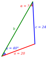 Given: side a = 20, side c = 24, and angle γ = 40°. Angle α is desired.