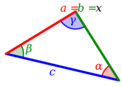 If the lengths of two sides of the triangle a and b are equal to x, the third side has length c, and the angles opposite the sides of lengths a, b, and c are α, β, and γ respectively then [math]\displaystyle{ \begin{align} & \alpha = \beta = \frac{180^\circ-\gamma}{2}= 90^\circ-\frac{\gamma}{2} \\[6pt] & \sin \alpha = \sin \beta = \sin \left(90^\circ-\frac{\gamma}{2}\right) = \cos \left(\frac{\gamma}{2}\right) \\[6pt] & \frac{c}{\sin \gamma}=\frac{a}{\sin \alpha}=\frac{x}{\cos \left(\frac{\gamma}{2}\right)} \\[6pt] & \frac{c \cos \left(\frac{\gamma}{2}\right)}{\sin \gamma} = x \end{align} }[/math]