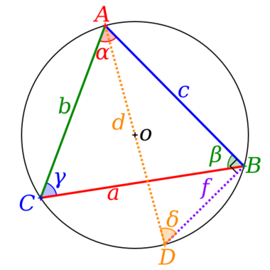 As shown in the figure, let there be a circle with inscribed [math]\displaystyle{ \triangle ABC }[/math] and another inscribed [math]\displaystyle{ \triangle ADB }[/math] that passes through the circle's center O. The [math]\displaystyle{ \angle AOD }[/math] has a central angle of [math]\displaystyle{ 180^\circ }[/math] and thus [math]\displaystyle{ \angle ABD = 90^\circ }[/math], by Thales's theorem. Since [math]\displaystyle{ \triangle ABD }[/math] is a right triangle, [math]\displaystyle{ \sin{\delta}= \frac{\text{opposite}}{\text{hypotenuse}}= \frac{c}{2R}, }[/math] where [math]\displaystyle{ R= \frac{d}{2} }[/math] is the radius of the circumscribing circle of the triangle.[9] Angles [math]\displaystyle{ {\gamma} }[/math] and [math]\displaystyle{ {\delta} }[/math] have the same central angle thus they are the same, by the inscribed angle theorem: [math]\displaystyle{ {\gamma} = {\delta} }[/math]. Therefore, [math]\displaystyle{ \sin{\delta} = \sin{\gamma} = \frac{c}{2R}. }[/math]