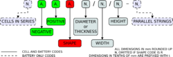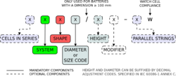 | Designation | Series Cells | System | Shape | Standardized code or diameter code | Diameter modifier | Height code | Height adjustment modifier | Modifier(s) | Parallel strings | Remarks |