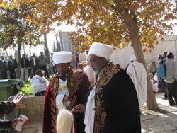 Qesat saying a prayer for Jews from Ethiopia who perished in Sudan on their way to Israel. Qes Samai Maharat Elias is on the left.