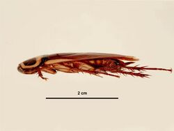 The Australian cockroach (Periplaneta australasiae) is a common species of tropical cockroach, with a length of 23–35 mm (0.91–1.38 in).[2][3] It is brown overall, with the tegmina having a conspicuous lateral pale stripe or margin, and the pronotum (head shield) with a sharply contrasting pale or yellow margin.[2][4] It is very similar in appearance to the American cockroach and may be easily mistaken for it. It is, however, slightly smaller than the American cockroach, and has a yellow margin on the thorax and yellow streaks at its sides near the wing base.