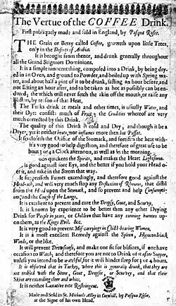 A 1674 London advertising broadsheet characterised coffee as a panacea:[10][11]