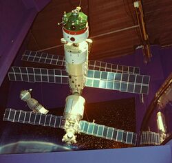 | The base block for the entire Mir complex, the core module, or DOS-7, provided the main living quarters for resident crews and contained environmental systems, early attitude control systems and the station's main engines. The module was based on hardware developed as part of the Salyut programme, and consisted of a stepped-cylinder main compartment and a spherical 'node' module, which served as an airlock and provided ports to which four of the station's expansion modules were berthed and to which a Soyuz or Progress spacecraft could dock. The module's aft port served as the berthing location for Kvant-1.[19][page needed] | ||||||