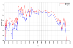 Mir was maintained in a near circular orbit with an average perigee of 354 km (220 mi) and an average apogee of 374 km (232 mi), travelling at an average speed of 27,700 km/h (17,200 mph) and completing 15.7 orbits per day.[6][7][8] As the station constantly lost altitude because of slight atmospheric drag, it needed to be boosted to a higher altitude several times each year. This boost was generally performed by Progress resupply vessels, although during the Shuttle-Mir programme the task was performed by US Space Shuttles, and, prior to the arrival of Kvant-1, the engines on the core module could also accomplish the task.[17]