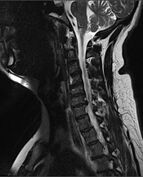 | MRI of a fractured and dislocated cervical vertebra (C4) in the neck that is compressing the spinal cord | |