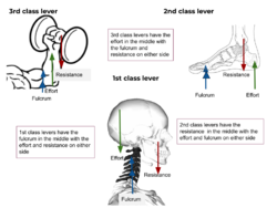 Levers are classified by the relative positions of the fulcrum, effort and resistance (or load). It is common to call the input force "effort" and the output force "load" or "resistance". This allows the identification of three classes of levers by the relative locations of the fulcrum, the resistance and the effort:[7]