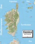 listen); Template:Lang-lij) is an island in the Mediterranean Sea and one of the 18 regions of France . It is the fourth-largest island in the Mediterranean and lies southeast of the French mainland, west of the Italian Peninsula and immediately north of the Italian island of Sardinia, the nearest land mass. A single chain of mountains makes up two-thirds of the island. (As of January 2024), it had a population of 355,528.[1]