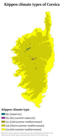 Under the Köppen climate classification scheme, coastal regions are characterized by a hot-summer Mediterranean climate (Csa). Further inland, a warm-summer Mediterranean climate (Csb) is more common. At the highest elevation locations, small areas with a subarctic climate (Dsc, Dfc) and the rare cold-summer Mediterranean climate (Csc) can be found.