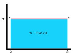 It is often valuable to calculate the work done in a process. The work done in a process is the area beneath the process path on a P-V diagram. Figure 2 If the process is isobaric, then the work done on the piston is easily calculated. For example, if the gas expands slowly against the piston, the work done by the gas to raise the piston is the force F times the distance d. But the force is just the pressure P of the gas times the area A of the piston, F = PA.[4] Thus