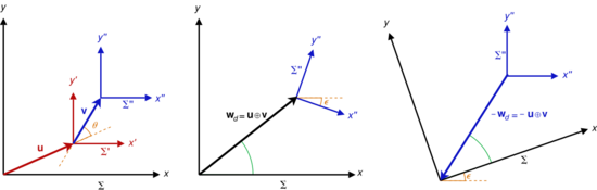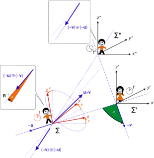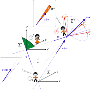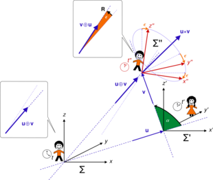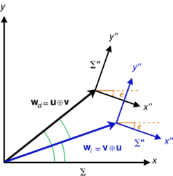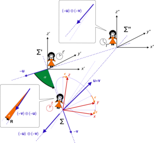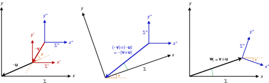 The velocity of Σ′′ as seen in Σ is denoted wd = u ⊕ v, where ⊕ refers to the relativistic addition of velocity (and not ordinary vector addition), given by[16]