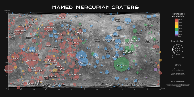 From Handwiki This is a list of named craters on Mercury, the innermost planet of the Solar System (for other features, see list of geological features on Mercury).[2] Most Mercurian craters are named after famous writers, artists and composers. According to the rules by IAU's Working Group for Planetary System Nomenclature, all new craters must be named after an artist that was famous for more than fifty years, and dead for more than three years, before the date they are named.[6] Craters larger than 250 km in diameter are referred to as "basins" (also see § Terminology).[7][8]