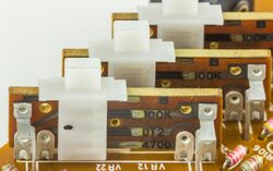A fader is any device used for fading, especially when it is a knob or button that slides along a track or slot. It is principally a variable resistance or potentiometer also called a ‘pot’.[4] A contact can move from one end to another. As this movement takes place the resistance of the circuit can either increase or decrease.[4] At one end the resistance of the scale is at 0 and at the other side it is infinite.[4] A. Nisbett explains the fader law as follows in his book called The Sound studio:"The ‘law’ of the fader is near-logarithmic over much of its range, which means that a scale of decibels can be made linear (or close to it) over a working range of perhaps 60 dB. If the resistance were to increase according to the same law beyond this, it would be twice as long before reaching a point where the signal is negligible. But the range below -50 dB is of little practical use, so here the rate of fade increases rapidly to the final cut-off".