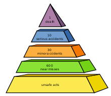 Accident triangles have been proposed to model the number of minor problems vs. the number of serious incidents. These include Heinrich's triangle[19] and Frank E. Bird's accident ratio triangle (proposed in 1966 and shown above).