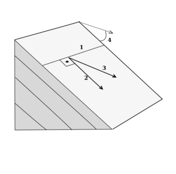 Rock plane orientations are the natural inclinations that occurred on a rock plane.[8] Some examples of rock planes are bedding planes, fault planes. The planes' orientations are measured by dip and dip direction with a clinometer and compass, where dip represents the maximum inclination of a plane to the horizontal, dip direction is the direction of the intersection line between horizontal and the inclined plane.[9] A stereonet can visualise the distribution of dip and dip directions to analyse the kinematics of a slope.[9]