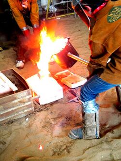 In metalworking and jewelry making, casting is a process in which a liquid metal is delivered into a mold (usually by a crucible) that contains a negative impression (i.e., a three-dimensional negative image) of the intended shape. The metal is poured into the mold through a hollow channel called a sprue. The metal and mold are then cooled, and the metal part (the casting) is extracted. Casting is most often used for making complex shapes that would be difficult or uneconomical to make by other methods.[1]