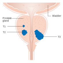 Factors that increase the risk of prostate cancer include older age, a family history of the disease, and race.[4] About 99% of cases occur in males over the age of 50.[4] Having a first-degree relative with the disease increases the risk two to threefold.[4] Other factors that may be involved include a diet high in processed meat, red meat or milk products or low in certain vegetables.[4] An association with gonorrhea has been found, but a reason for this relationship has not been identified.[9] An increased risk is associated with the BRCA mutations.[10] Prostate cancer is diagnosed by biopsy.[3]Medical imaging may then be done to determine if the cancer has spread to other parts of the body.[3]