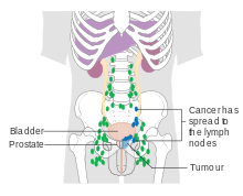Prostate cancer is considered a malignant tumor because it can invade other areas of the body. This invasion is called metastasis. Prostate cancer most commonly metastasizes to the bones and lymph nodes, and may invade the rectum, bladder, and lower ureters after local progression. The route of metastasis to bone is thought to be venous, as the prostatic venous plexus draining the prostate connects with the vertebral veins.[63]