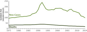New cases and deaths from prostate cancer in the United States per 100,000 males between 1975 and 2014