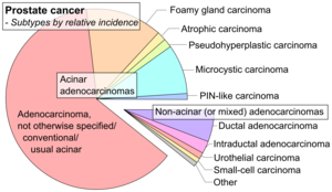 A histopathologic diagnosis mainly includes assessment of whether a cancer exists, as well as any subdiagnosis, if possible. Histopathologic subdiagnosis has implications for the possibility and methodology of Gleason scoring.[85] The most common histopathological subdiagnosis is acinar adenocarcinoma, constituting 93% of diagnoses.[86] The most common form of acinar adenocarcinoma, in turn, is "adenocarcinoma, not otherwise specified", also termed conventional, or usual acinar adenocarcinoma.[87]