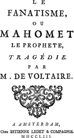 - Le fanatisme, ou Mahomet le prophète (1736) by Voltaire, notable for its critical depiction of Muhammad,[11] described as a self-deceived,[12] perverted[12] religious fanatic and manipulator,[11][12] and his hunger for political power behind the foundation of Islam.[11][12]