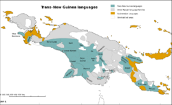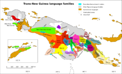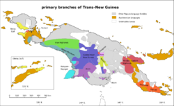 | Irian Jaya, W to E South Bird's Head West Trans–New Guinea Kaure–Kapori Pauwasi Mek Asmat–Kamoro Awyu–Dumut Ok Kayagar Marind Kolopom | PNG highlands, W to E Awin–Pa East Strickland Duna Bosavi Engan West Kutubuan East Kutubuan Chimbu–Wahgi Kainantu–Goroka Madang Finisterre–Huon | Southern PNG, E to W Binanderean Southeast Papuan Angan Eleman Teberan Turama–Kikorian Kiwai–Porome Inland Gulf Gogodala–Suki Tirio isolates* |