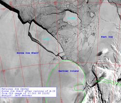 Iceberg B15 calved from the Ross Ice Shelf in 2000 and initially had an area of 11,000 square kilometres (4,200 sq mi). It broke apart in November 2002. The largest remaining piece of it, Iceberg B-15A, with an area of 3,000 square kilometres (1,200 sq mi), was still the largest iceberg on Earth until it ran aground and split into several pieces October 27, 2005, an event that was observed by seismographs both on the iceberg and across Antarctica.[43] It has been hypothesized that this breakup may also have been abetted by ocean swell generated by an Alaskan storm 6 days earlier and 13,500 kilometres (8,400 mi) away.[44][45]