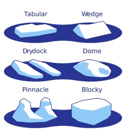 Icebergs vary considerably in size and shape. Icebergs that calve from glaciers in Greenland are often irregularly shaped while Antarctic ice shelves often produce large tabular (table top) icebergs. The largest iceberg in recent history, named B-15, was measured at nearly 300 by 40 kilometres (186 by 25 mi) in 2000.[6] The largest iceberg on record was an Antarctic tabular iceberg measuring 335 by 97 kilometres (208 by 60 mi) sighted 240 kilometres (150 mi) west of Scott Island, in the South Pacific Ocean, by the USS Glacier on November 12, 1956. This iceberg was larger than Belgium.[7]