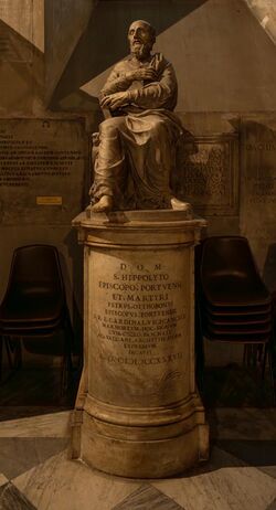Starting in the fourth century, various legends arose about him, identifying him as a priest of the Novatianist schism or as a soldier converted by Saint Lawrence. He has also been confused with another martyr of the same name.[2] Pope Pius IV identifies him as "Saint Hippolytus, Bishop of Pontus" who was martyred in the reign of Severus Alexander through his inscription on a statue found at the Church of Saint Lawrence in Rome and kept at the Vatican as photographed and published in Bunsen.[3]