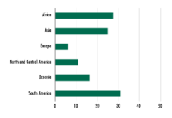 The biodiversity of forests varies considerably according to factors such as forest type, geography, climate and soils – in addition to human use.[58] Most forest habitats in temperate regions support relatively few animal and plant species and species that tend to have large geographical distributions, while the montane forests of Africa, South America and Southeast Asia and lowland forests of Australia, coastal Brazil, the Caribbean islands, Central America and insular Southeast Asia have many species with small geographical distributions.[58] Areas with dense human populations and intense agricultural land use, such as Europe, parts of Bangladesh, China, India and North America, are less intact in terms of their biodiversity. Northern Africa, southern Australia, coastal Brazil, Madagascar and South Africa, are also identified as areas with striking losses in biodiversity intactness.[58] European forests in EU and non-EU nations comprise more than 30% of Europe's land mass (around 227 million hectares), representing an almost 10% growth since 1990.[63][64]