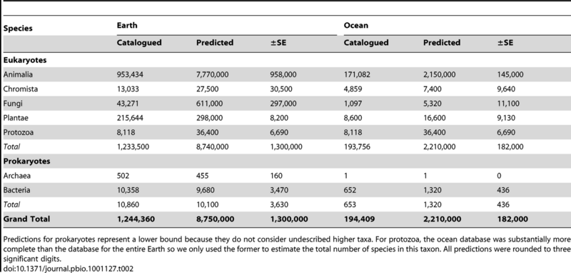 According to Mora and colleagues' estimation, there are approximately 8.7 million terrestrial species and 2.2 million oceanic species. The authors note that these estimates are strongest for eukaryotic organisms and likely represent the lower bound of prokaryote diversity.[25] Other estimates include: