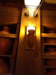 The second deck contains more animal models, along with dioramas of Noah's workshop and a blacksmith.[11] Bays on the third deck contain displays presenting AiG's ideas of what may have happened inside and outside the ark during the flood.[11] Displays in three of the bays display artifacts from the Green Collection and promote the Museum of the Bible, a Washington, D.C. attraction constructed by the Green family, who donated to the Ark Encounter's construction.[15] RoadsideAmerica.com wrote that the displays depicting the sinful state of the world before the flood, including a priest sacrificing an infant to an unnamed snake god and people murdered in a gladiatorial event in an arena, were among the most memorable exhibits in the attraction.[16]