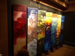 Ark Encounter opened on July 7, 2016, a date (7/7) chosen to correspond with Genesis 7:7: "And Noah and his sons and his wife and his sons' wives entered the ark to escape the waters of the flood."[51] AiG also announced that, for the first 40 days and 40 nights of Ark Encounter's operation – an allusion to the inundation period (rain and subterranean hydrological eruptions) of the biblical flood – it would extend its hours of operation, offering day and evening tickets.[52] On July 5, AiG held a ribbon-cutting ceremony for the Ark Encounter, during which members of the media and an estimated 7,000 donors to the project were given an early tour of the ark.[53] According to the park's publicists, there were 30,000 visitors in its first six days of operation (an average of 5,000 per day).[54]