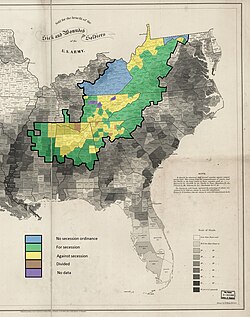 In Virginia, the populous counties along the Ohio and Pennsylvania borders rejected the Confederacy. Unionists held a Convention in Wheeling in June 1861, establishing a "restored government" with a rump legislature, but sentiment in the region remained deeply divided. In the 50 counties that would make up the state of West Virginia, voters from 24 counties had voted for disunion in Virginia's May 23 referendum on the ordinance of secession.[104] In the 1860 Presidential election "Constitutional Democrat" Breckenridge had outpolled "Constitutional Unionist" Bell in the 50 counties by 1,900 votes, 44% to 42%.[105] Regardless of scholarly disputes over election procedures and results county by county, altogether they simultaneously supplied over 20,000 soldiers to each side of the conflict.[106][107] Representatives for most of the counties were seated in both state legislatures at Wheeling and at Richmond for the duration of the war.[108]