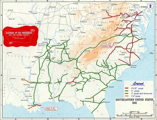 The Confederacy had no plan to expand, protect or encourage its railroads. Southerners' refusal to export the cotton crop in 1861 left railroads bereft of their main source of income.[300] Many lines had to lay off employees; many critical skilled technicians and engineers were permanently lost to military service. In the early years of the war the Confederate government had a hands-off approach to the railroads. Only in mid-1863 did the Confederate government initiate a national policy, and it was confined solely to aiding the war effort.[301] Railroads came under the de facto control of the military. In contrast, the U.S. Congress had authorized military administration of Union-controlled railroad and telegraph systems in January 1862, imposed a standard gauge, and built railroads into the South using that gauge. Confederate armies successfully reoccupying territory could not be resupplied directly by rail as they advanced. The C.S. Congress formally authorized military administration of railroads in February 1865.