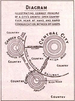 The Garden city movement was founded by Ebenezer Howard (1850-1928).[12] His ideas were expressed in the book Garden Cities of To-morrow (1898).[13] His influences included Benjamin Walter Richardson, who had published a pamphlet in 1876 calling for low population density, good housing, wide roads, an underground railway and for open space; Thomas Spence who had supported common ownership of land and the sharing of the rents it would produce; Edward Gibbon Wakefield who had pioneered the idea of colonizing planned communities to house the poor in Adelaide (including starting new cities separated by green belts at a certain point); James Silk Buckingham who had designed a model town with a central place, radial avenues and industry in the periphery; as well as Alfred Marshall, Peter Kropotkin and the back-to-the-land movement, which had all called for the moving of masses to the countryside.[14]