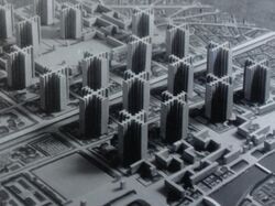 Le Corbusier (1887–1965) pioneered a new urban form called towers in the park. His approach was based on defining the house as 'a machine to live in'.[38] The Plan Voisin he devised for Paris, which was never fulfilled, would have involved the demolition of much of historic Paris in favour of 18 uniform 700-foot tower blocks.[39] Ville Contemporaine and the Ville Radieuse formulated his basic principles, including decongestion of the city by increased density and open space by building taller on a smaller footprint.[39] Wide avenues should also be built to the city centre by demolishing old structures, which was criticized for lack of environmental awareness.[39] His generic ethos of planning was based on the rule of experts who would "work out their plans in total freedom from partisan pressures and special interests" and that "once their plans are formulated, they must be implemented without opposition".[40] His influence on the Soviet Union helped inspire the 'urbanists' who wanted to build planned cities full of massive apartment blocks in Soviet countryside.[40] The only city which he ever actually helped plan was Chandigarh in India .[41] Brasília, planned by Oscar Niemeyer, also was heavily influenced by his thought.[42] Both cities suffered from the issue of unplanned settlements growing outside them.[43]