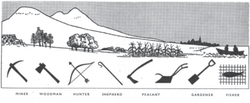 Patrick Geddes (1864-1932) was the founder of regional planning.[21] His main influences were the geographers Élisée Reclus and Paul Vidal de La Blache, as well as the sociologist Pierre Guillaume Frédéric le Play.[22] From these he received the idea of the natural region.[23] According to Geddes, planning must start by surveying such a region by crafting a "Valley Section" which shows the general slope from mountains to the sea that can be identified across scale and place in the world, with the natural environment and the cultural environments produced by it included.[24] This was encapsulated in the motto "Survey before Plan".[25] He saw cities as being changed by technology into more regional settlements, for which he coined the term conurbation.[26] Similar to the garden city movement, he also believed in adding green areas to these urban regions.[26] The Regional Planning Association of America advanced his ideas, coming up with the 'regional city' which would have a variety of urban communities across a green landscape of farms, parks and wilderness with the help of telecommunication and the automobile.[27] This had major influence on the County of London Plan, 1944.[28]