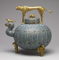 From either Byzantium or the Islamic world, the cloisonné technique reached China in the 13–14th centuries. The first written reference to cloisonné is in a book from 1388, where it is called "Dashi ('Muslim') ware".[5] No Chinese pieces that are clearly from the 14th century are known; the earliest datable pieces are from the reign of the Xuande Emperor (1425–1435), which, since they show a full use of Chinese styles, suggest considerable experience in the technique.
