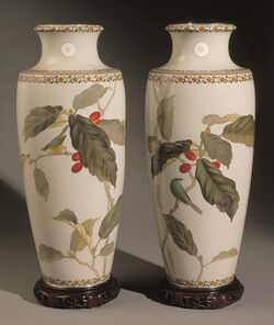 Gottfried Wagener was a German scientist brought in by the government to advise Japanese industry and improve production processes. Along with Namikawa Yasuyuki he developed a transparent black enamel which was used for backgrounds. Translucent enamels in various other colours followed during this period.[6] Along with Tsukamoto Kaisuke, Wagener transformed the firing processes used by Japanese workshops, improving the quality of finishes and extending the variety of colours.[6] Kawade Shibatarō introduced a variety of techniques, including nagare-gusuri (drip-glaze) which produces a rainbow-coloured glaze and uchidashi (repoussé) technique, in which the metal foundation is hammered outwards to create a relief effect.[10] Together with Hattori Tadasaburō he developed the moriage ("piling up") technique which places layers of enamel upon each other to create a three-dimensional effect.[11] Namikawa Sōsuke developed a pictorial style that imitated paintings. He is known for shosen (minimised wires) and musen (wireless cloisonné): techniques developed with Wagener in which the wire cloisons are minimised or burned away completely with acid.[12][7] This contrasts with the Chinese style which used thick metal cloisons.[6] Ando Jubei introduced the shōtai-jippō (plique-à-jour) technique which burns away the metal substrate to leave translucent enamel, producing an effect resembling stained glass.[13] The Ando Cloisonné Company which he co-founded is one of the few makers from this era still active.[6] Distinctively Japanese designs, in which flowers, birds and insects were used as themes, became popular. Designs also increasingly used areas of blank space.[7] With the greater subtlety these techniques allowed, Japanese enamels were regarded as unequalled in the world[14] and won many awards at national and international exhibitions.[12][15]