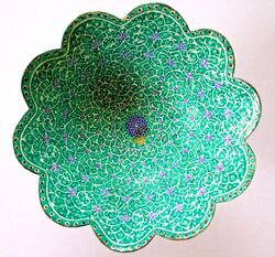 Enamel was established in the Mughal Empire by around 1600 for decorating gold and silver objects, and became a distinctive feature of Mughal jewellery. The Mughal court was known to employ mīnākār (enamelers).[16] These craftsmen reached a peak of during the reign of Shah Jahan in the mid-17th century. Transparent enamels were popular during this time.[16] Both cloissoné and champlevé were produced in Mughal, with champlevé used for the finest pieces.[16] Modern industrial production began in Calcutta in 1921, with the Bengal Enamel Works Limited.