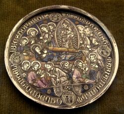 The Royal Gold Cup with basse-taille enamels; weight 1.935 kg, British Museum. Saint Agnes appears to her friends in a vision.