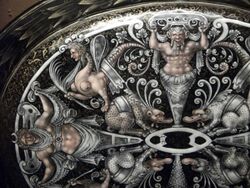 The technique appears in the Koban culture of the northern and central Caucasus, and was perhaps carried by the Sarmatians to the ancient Celts.[3] Red enamel is used in 26 places on the Battersea Shield (c.350–50 BC), probably as an imitation of the red Mediterranean coral, which is used on the Witham Shield (400–300 BC). Pliny the Elder mentions the Celts' use of the technique on metal, which the Romans in his day hardly knew. The Staffordshire Moorlands Pan is a 2nd-century AD souvenir of Hadrian's Wall, made for the Roman military market, which has swirling enamel decoration in a Celtic style. In Britain, probably through preserved Celtic craft skills, enamel survived until the hanging bowls of early Anglo-Saxon art.