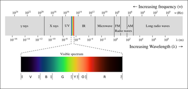Light or visible light is electromagnetic radiation that can be perceived by the human eye.[1] Visible light is usually defined as having wavelengths in the range of 400–700 nanometres (nm), corresponding to frequencies of 750–420 terahertz, between the infrared (with longer wavelengths) and the ultraviolet (with shorter wavelengths).[2][3]
