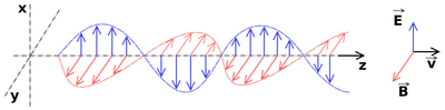 In physics, the term "light" may refer more broadly to electromagnetic radiation of any wavelength, whether visible or not.[4][5] In this sense, gamma rays, X-rays, microwaves and radio waves are also light. The primary properties of light are intensity, propagation direction, frequency or wavelength spectrum, and polarization. Its speed in vacuum, 299792458 m/s, is one of the fundamental constants of nature.[6] Like all types of electromagnetic radiation, visible light propagates by massless elementary particles called photons that represents the quanta of electromagnetic field, and can be analyzed as both waves and particles. The study of light, known as optics, is an important research area in modern physics.